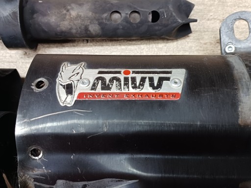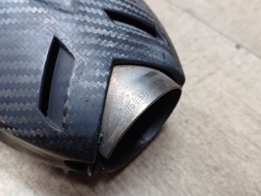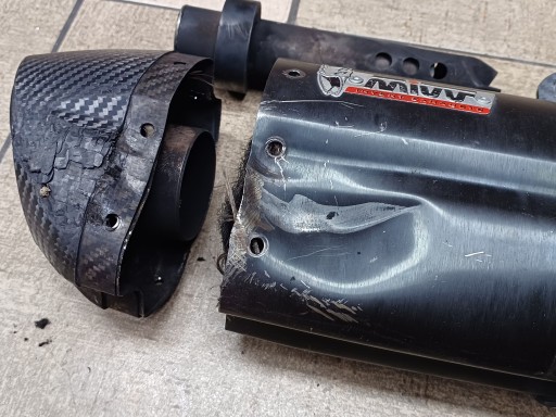 Tłumik posiada wgniecenia i uszkodzenia jak na zdjęciach. Roznitowana końcówka wydechu. W zestawie db-kiler.