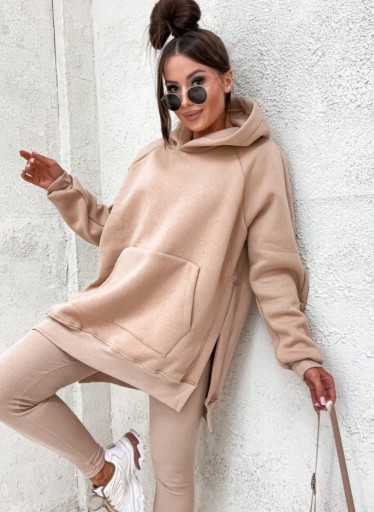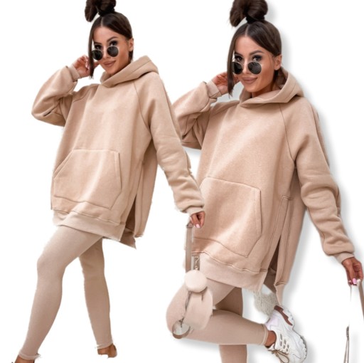 Komplet 2-częściowy składający się z CIEPŁEJ DŁUGIEJ BLUZY Z ROZCIĘCIAMI PO BOKACH, i prążkowanych legginsów to idealny strój dla kobiet ceniących sobie modny i wygodny styl. Bluza z długim rękawem i kapturem zapewni komfort i ciepło w chłodne dni, a jednocześnie dodaje charakteru całej stylizacji, a prążkowane legginsy mogą dodać subtelnej elegancji i wyróżnić się w tłumie.