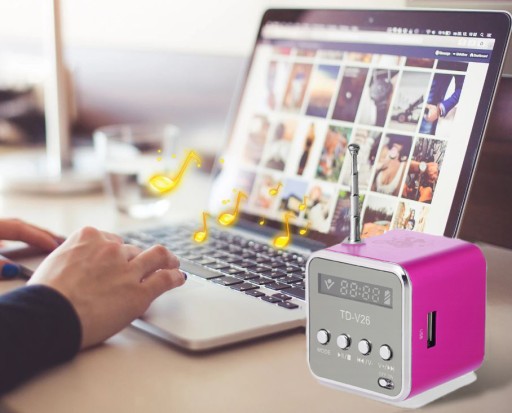 - Urządzenie pozwala na odtwarzanie muzyki przez wbudowane głośniki w każdym miejscu bez konieczności posiadania dostępu do zasilania