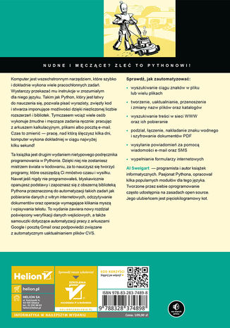 Komputer jest wszechstronnym narzędziem, które szybko i dokładnie wykona wiele pracochłonnych zadań. Wystarczy przekazać mu instrukcje w zrozumiałym dla niego języku. Takim jak Python, który jest łatwy do nauczenia się, pozwala pisać wyrazisty, zwięzły kod i stwarza imponujące możliwości dzięki niezliczonej liczbie rozszerzeń i bibliotek. Tymczasem wciąż wiele osób wykonuje żmudne i męczące zadania ręcznie: pracując z arkuszem kalkulacyjnym, plikami albo pocztą e-mail. Czas to zmienić - pracę, nad którą ślęczysz kilka dni, komputer wykona dokładniej w ciągu najwyżej kilku sekund!