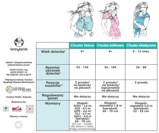 Chusta tkana LennyLamb została uznana za "zdrową dla stawów biodrowych" przez Międzynarodowy Instytut Dysplazji Stawów Biodrowych (International Hip Dysplasia Institute).