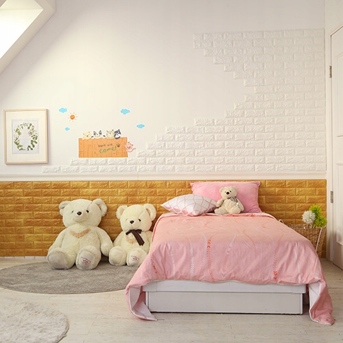 Panele są samoprzylepne, więc nie wymagają używania kleju, a co za tym idzie – jest to szybka, czysta i przyjemna praca, którą można wykonać samodzielnie bez potrzeby wynajmowania ekip montażowych. Odklejasz papier zabezpieczający klej i bezpośrednio przyklejasz na ścianę.