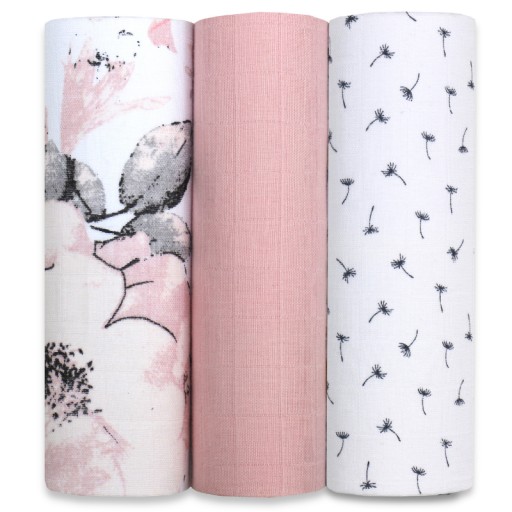 Zestaw zawiera 3 pieluszki muślinowe w rozmiarze 60x80cm - dwie we wzorki, jedna gładka. Pieluszki pakowane na płasko.