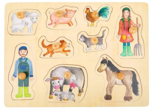 Drewniana łamigłówka zawiera ręcznie malowane puzzle z gałkami do chwytania z tematycznego świata farmy i wiejskiego życia. Kawałki układanki mogą być łatwo chwytane przez dzieci i ustawiane we wstępnie wyciętych pozycjach, układanka ćwiczy zdolności motoryczne i cierpliwość.