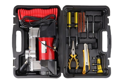 Mocny, metalowy kompresor dwu tłowkowy z manometrem. Kompresor przeznaczony jest w do pompowania kół, piłek, pontonów, basenów i innych, dzięki trzem różnym końcówkom do wentyli w zestawie. Daje sobie radę z dużymi kołami samochodów 4x4 - SUV - Van - Truc