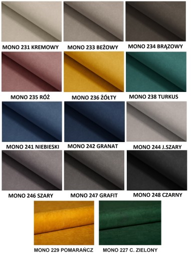 Tkanina Monolith to wytrzymały i mocny, a przy tym wyjątkowo przyjemny w dotyku materiał welurowy o subtelnym połysku odbijającym światło z efektem melanżu. Nie jest całkowicie gładki a jego delikatny deseń przypomina nieco kaszmir. Pokryta jest specjalną warstwą ochronną, tworząca hydrofobową powłokę zabezpieczającą przed szybkim przesiąkaniem płynów. Świetnie sprawdzi się w każdym domu oraz w lokalach użytku publicznego. To również świetna tkanina dla dzieci i materiał odporny na zwierzęta.