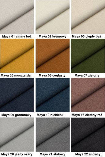 Maya to tkanina marki Fargotex, miękka i bardzo gładka dzianina (welur), w dotyku przypominająca kaszmir. Naniesiony print wygląda jak delikatny splot tkaninowy. Tkanina nie cieniująca się tzn. że po przejechaniu ręką nie zmienia koloru. Estetyką wpisuje się w styl skandynawski. Sprawdzi się w pokoju dziennym, sypialni i pokojach dziecięcych. Kolorystyka opiera się na aktualnych trendach z rozbudowaną gamą zgaszonych pasteli.