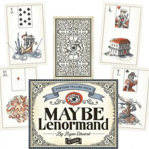 Maybe Lenormand hołduje tradycji Lenormand ze stylowymi ilustracjami, które przekazują podstawowe znaczenie każdej karty. Rozszerzając 36-kartową Petit Lenormand, projektant Ryan Edward stworzył 16 dodatkowych kart, aby uzupełnić pakiet 52 kart, zgodnie z dziedzictwem kart wróżbiarskich opartych na taliach kart do gry.