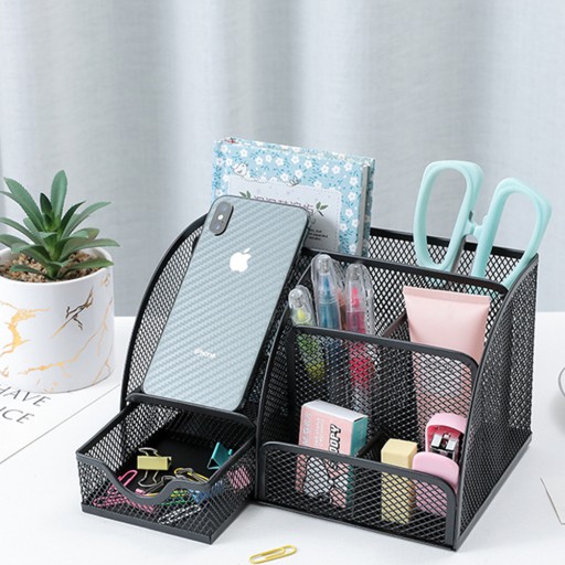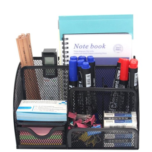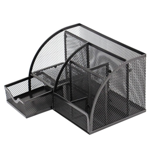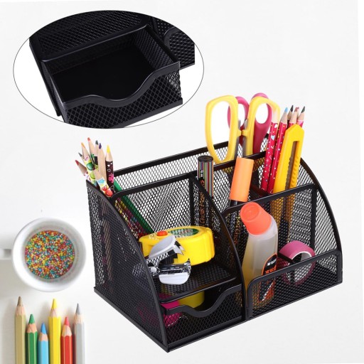 ✔️ SIATKOWY METALOWY STOJAK DO PRZECHOWYWANIA Z 1 SZUFLADĄ I 6 PRZEGRÓDKAMI NA DŁUGOPISY, ZSZYWACZE, OŁÓWKI, NOŻYCZKI