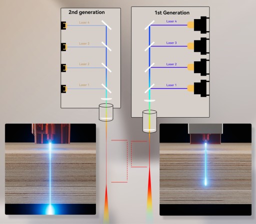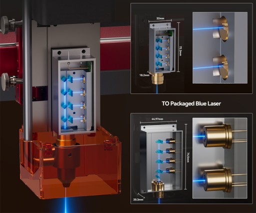 Laserowa maszyna grawerująca A24 Pro posiada technologię niebieskiego lasera drugiej generacji i wykorzystuje proces pakowania poprzez kompresję włókien. Zmniejsza to rozmiar punktu lasera, poprawia zdolność cięcia i poprawia wydajność rozpraszania ciepła, zapewniając dłuższą żywotność. Proces pakowania poprawia również stabilność i niezawodność lasera oraz zmniejsza straty energii podczas kompresji.