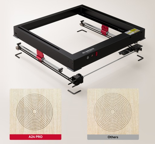 Laserowa maszyna grawerująca A24 PRO jest w stanie obrabiać różnorodne materiały, m.in. drewno, kamień i metal. Może wykonywać cięcie, rzeźbienie i drążenie, aby spełnić różne wymagania. Dzięki ulepszonej technologii łączenia punktu kompresji osiągany jest zakres ogniskowania wynoszący zaledwie 0,06 x 0,06 mm. Laser o dużej gęstości z łatwością tnie sklejkę i akryl oraz graweruje stal nierdzewną, ceramikę i szkło, zapewniając o 40% większą prędkość rzeźbienia i cięcia w porównaniu z tradycyjnymi modelami. Jego ostateczny efekt cięcia może konkurować z maszyną do grawerowania laserowego CO₂ o mocy 300 W.