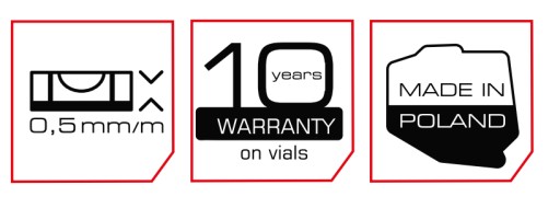 Poziomnicę wyposażono w innowacyjną libellę poziomu "ŁATWY ODCZYT" o dokładności pomiaru 0,5 mm/m = 0,029°, która zastąpiła tradycyjną libellę w kształcie sześcianu.