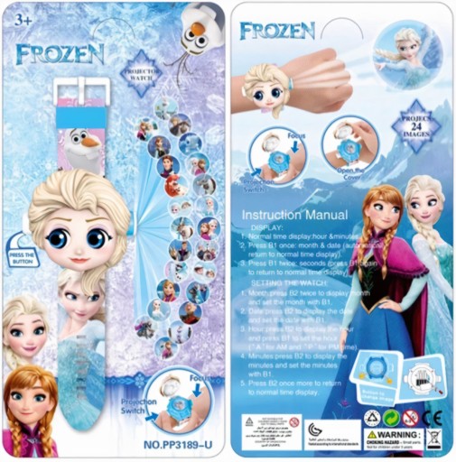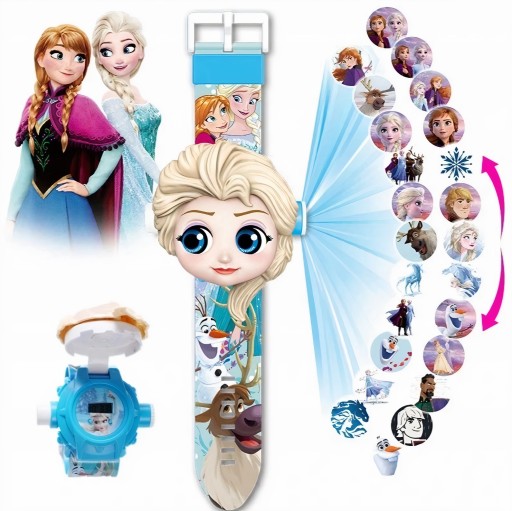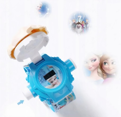 Zegarek posiada projektor do wyświetlania 24 obrazków z postaciami z bajki "Kraina Lodu". Aby wyświetlać obrazki wystarczy przytrzymać przycisk z boku zegarka a następnie przekręcając pokrętło regulujemy ostrość wyświetlanych obrazków.