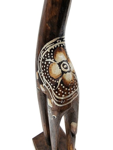 - Figura żyrafy wykonana jest z drewna w odcieniach brązowych i białych z przecierkami