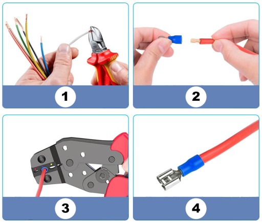 3️⃣ Mocno zaciśnij przewód w złączce (możesz do tego użyć specjalnych szczypiec zaciskowych lub kombinerek)