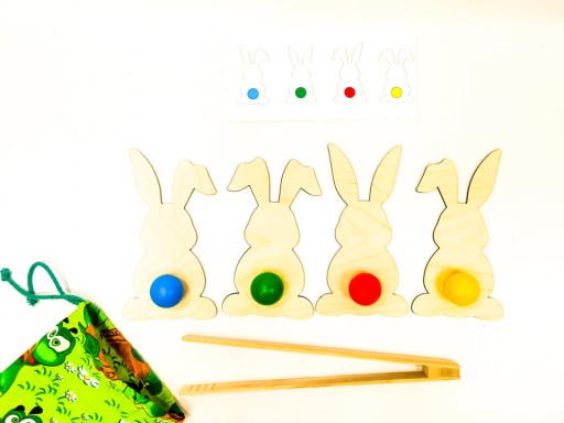 Musimy pomóc im je odnaleźć! Ale zadanie nie będzie takie proste, bo każdy zajączek chce odzyskać swój ogonek. Musimy ułożyć je według dołączonych kart pracy. Dziecko musi zwrócić uwagę, że każdy zajączek ma inne uszy :) Po ułożeniu zajęczych uciekinierów dziecko bierze drewniane szczypce i układa odpowiedni kolor ogonka na odpowiedniego zająca.