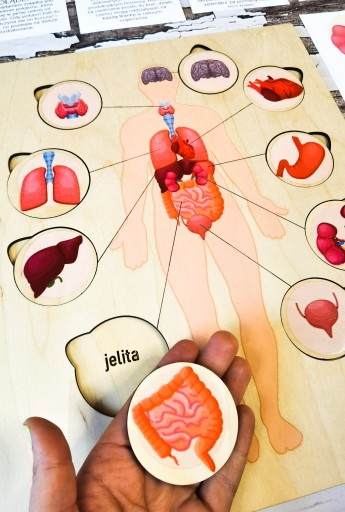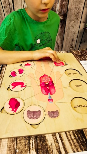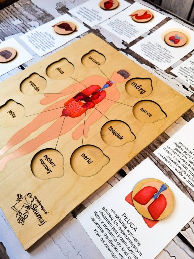 Narządy człowieka, drewniana układanka, podpisy, wyciągane elementy