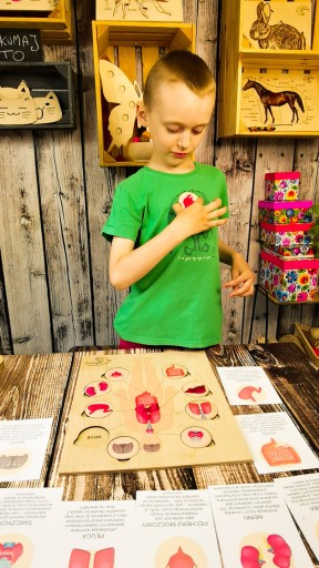 Dziecko poprzez ciekawą zabawę pracuje nad koordynacją ręka-oko, małą motoryką, trenuje czytanie i dowiaduje się jak wyglądają i jakie funkcje pełnią poszczególne narządy- to wspaniały wstęp do anatomii!