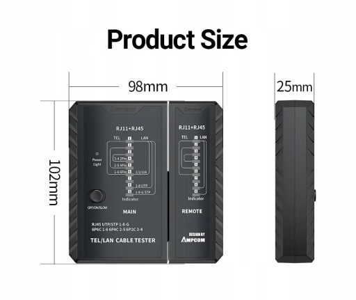 DIODOWY TESTER KABLI SIECIOWYCH RJ45 I TELEFONICZNYCH RJ11 UTP/STP AMPCOM