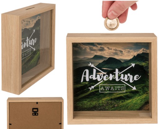 Skarbonka drewniana z okienkiem - ADVENTURE AWAITS