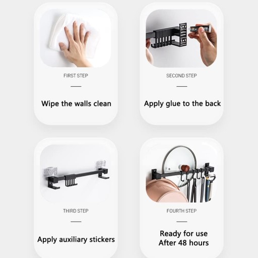 Oszczdno miejsca wieszaka na przybory kuchenne nasz uchwyt cienny ma 6 ruchomych haczyków na przybory kuchenne z idealnymi odstpami midzy garnkami patelniami i innymi przyborami kuchennymi. Pomaga uporzdkowa szuflady i szafki jednoczenie utrzymujc wszystkie przedmioty w zasigu wzroku zapewniajc atwy dostp. Stojak na przybory kuchenne bez wiercenia Moesz zainstalowa ten wieszak kuchenny w cigu kilku minut bez uycia narzdzi lub rub. Posiada mocny klej bez gwodzi który nie odpadnie nawet w wilgotnych pomieszczeniach. Nadaje si do kadej gadkiej powierzchni i chroni ciany przed brzydkimi otworami. Dwie metody montau Metoda 1 Uyj doczonego kleju do montau stojaka na szyn kuchenn nadaje si tylko do gadkich nieporowatych powierzchni. Metoda 2 Prosz wywierci otwór w cianie aby zainstalowa baganik kuchenny który jest odpowiedni do wszystkich powierzchni. Duga ywotno Ten aluminiowy stojak na przybory kuchenne z anodowanym wykończeniem haczyka ma odporno na korozj zarysowania i matowienie. Wystarczajco mocny aby utrzyma do 6 kg bez deformacji. Kady haczyk na przybory jest gadki dziki czemu nie zaczepia si ani nie uszkodzi przedmiotów. Wszechstronne haczyki na przybory Mona go wykorzysta do maksymalizacji pustych cian w kadym pomieszczeniu. Nasze haczyki do szyn kuchennych wietnie nadaj si do przechowywania paszczy i nakadek w wejciu organizowania narzdzi w garau wieszania niezbdnych artykuów azienkowych przechowywania garnków i patelni i innych.