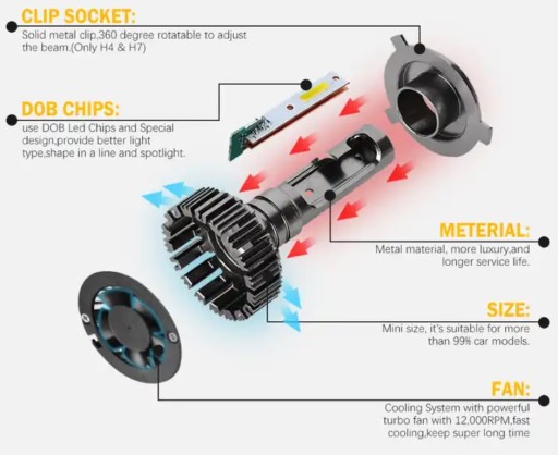 - JEDYNA w swoim rodzaju, unikalna kompaktowa konstrukcja z turbinowym systemem chłodzenia w korpusie, umożliwiająca montaż tam gdzie inne żarówki LED się nie mieszczą