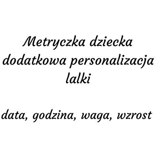 Jeśli pragniesz, aby Twoja lalka była wyjątkową pamiątką na całe życie, możemy dodatkowo umieścić na niej metryczkę.