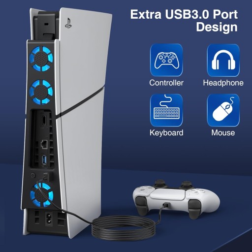 Dodatkowy port USB: Wentylator chłodzący do konsoli PS5 slim ma dodatkowy koncentrator USB 3.0 do ładowania kontrolera PS5 lub other urządzeń.