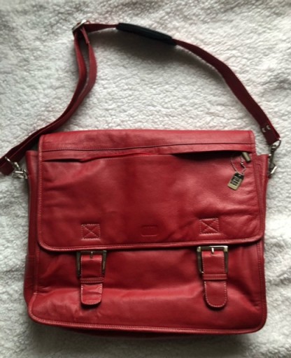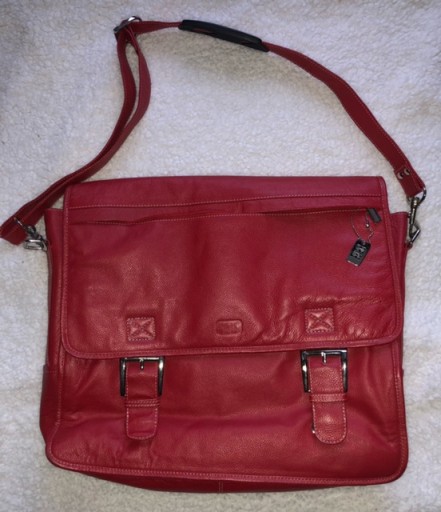 Torba uszyta ze skóry naturalnej. Na podszewce. Kieszonki wewnątrz i na zewnątrz. Zapinana na zatrzaski. Pasek regulowany