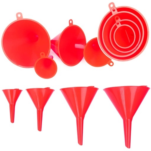 Zestaw 4 uniwersalnych lejków firmy FALON TECH z tworzywa sztucznego o różnych średnicach: 52, 76, 100, 120 mm. Bardzo uniwersalny zestaw przydatny w domu, garażu i warsztacie oraz wszędzie tam gdzie potrzebujemy przelewać różnego rodzaju płyny.