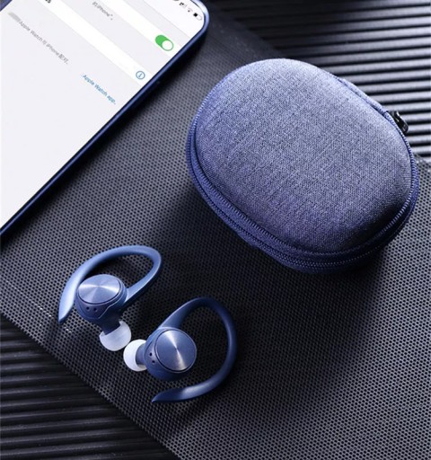 Etui wykonane jest z trwałego materiału, odpornego na zarysowania. Możesz je nosić w kieszeni lub w torebce bez obaw, że się porysuje. Etui ma również funkcję mobilnej ładowarki. Po włożeniu słuchawek do etui, automatycznie rozłączają się z urządzeniem odtwarzającym i zaczynają się ładować. Wbudowany mały wyświetlacz pokazuje stan naładowania każdej słuchawki osobno.