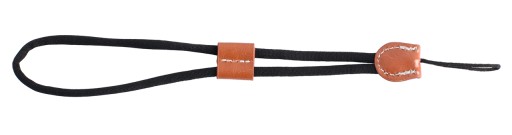Mały bawełniany pasek na nadgarstek do aparatu – CZARNY z elementami ekoskóry w kolorze BRĄZOWYM.