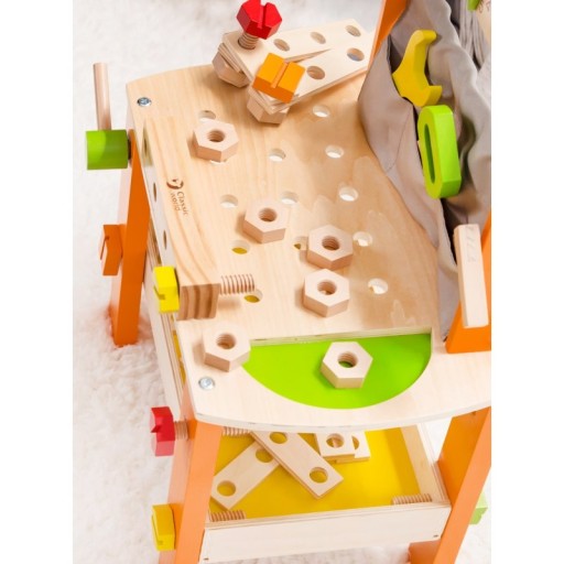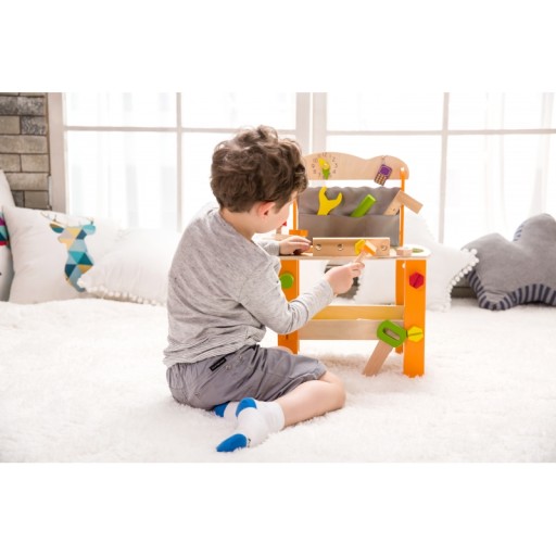 Wspaniały warsztat dla małego majsterkowicza z własnym stołem do napraw i z dużą ilością narzędzi. Do skręcenia samego warsztatu należy częściowo użyć śrubek z zestawu, więc już składanie zabawki jest zabawą. Całość można dowolnie skręcać i rozkręcać dołączonym śrubokrętem ćwicząc przy tym precyzję manualną oraz koncentrację. Warsztat stymuluje koordynację ręka-oko, pobudza wyobraźnię i gwarantuje znakomitą rozrywkę dla dziecka.