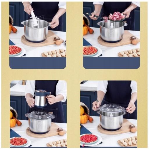 [Wyjmowana miska 5 l] Elektryczny rozdrabniacz jest wykonany ze stali nierdzewnej i jest wyposażony w misę miksującą o dużej pojemności 5 l, która umożliwia przygotowanie dużej ilości produktów na raz. ochraniaczy w antypoślizgowe gumowe podkładki, ma dobry efekt antypoślizgowy i antywibracyjny podczas użytkowania. Urządzenie jest wyjmowane, a akcesoria prostsze do czyszczenia.