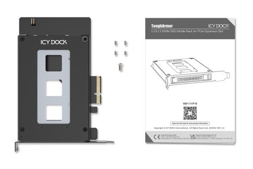 ToughArmor MB111VP-B, wzmocniona i wymienna obudowa dla dysków U.2/U.3 NVMe SSD, pasująca do slotu PCIe, obsługująca dyski U.2/U.3 NVMe SSD do wysokości 9,5 mm. Dzięki zdolności dopasowania się do pojedynczego gniazda rozszerzeń PCIe x4, ta innowacyjna wyjmowana obudowa typu rack pozwala na łatwe wyjmowanie dysków U.2/U.3 NVMe SSD ze slotu PCIe przy ograniczeniu zagracenia danymi i kablami zasilania.