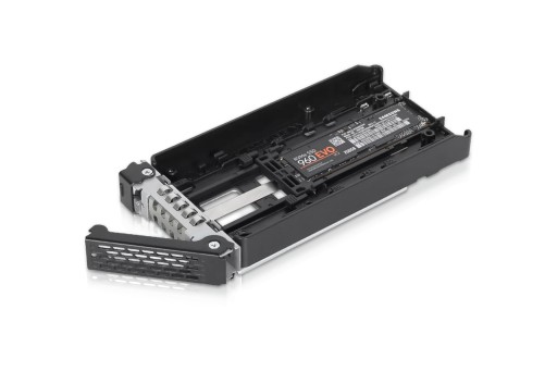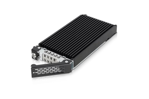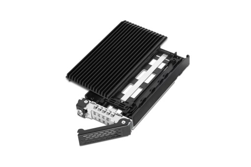 Ponieważ dyski SSD M.2 NVMe są znane z generowania wysokich temperatur, konieczne jest utrzymywanie temperatur roboczych przez cały czas, aby zapobiec spadkowi wydajności. Każda tacka na dyski jest wyposażona w bardzo dużą, wysokowydajną aluminiową pokrywę radiatora i podkładkę termiczną.