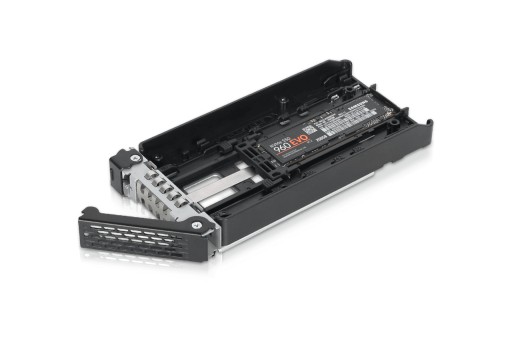Aby zainstalować nośnik M.2 PCIe NVMe SSD po prostu umieść go w kieszeni dyskowej, a następnie przesuń adapter zabezpieczający - nie ma potrzeby używania narzędzi ani śrubek.