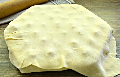 - z góry przykryć listkiem rozwałkowanego ciasta;