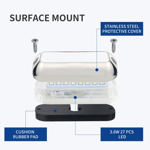 5. ŁATWA INSTALACJA: Dwa przewody i dwie śruby nadają się do każdego scenariusza z wykorzystaniem metod montażu powierzchniowego. Dodanie wodoodpornej i antypoślizgowej podkładki (bez) pomiędzy kadłubem a światłami może zapewnić podwójną ochronę.