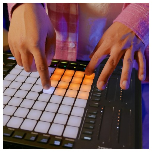 MOCNA PRODUKCJA I WYSTĘPY APC64 ułatwia płynną pracę w środowisku Ableton Live: od uruchamiania próbek i pętli w Drum Racku Ableton Live, po pisanie ekspresyjnych melodii przy użyciu trybów Nut, Skala i Akord. Wykorzystaj wbudowany sekwenser krokowy do generowania pomysłowych wzorców melodycznych, które można natychmiast przenieść do Ableton Live za pomocą funkcji Send To Clip. Zastosuj swing i kwantyzację do swoich rytmów lub użyj APC64 do uzbrajania i nagrywania ścieżek wokalnych bezpośrednio w sesjach Ableton Live.