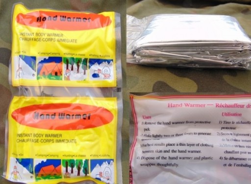- dwa ogrzewacze chemiczne - gdy nie będziemy mieli możliwości rozpalenia ognia, pozwolą nam przetrwać do rana w zimne noce, doskonałe także jako kompresy grzewcze na stłuczenia itp.