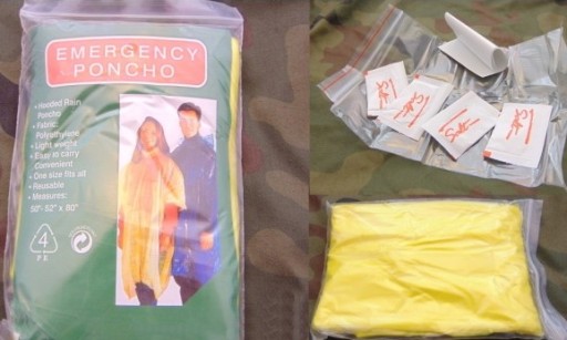 - poncho przeciwdeszczowe - rozmiar 50-52 x 80 - ochroni nas przed deszczem. Nic tak nie poprawi morale jak suchy ubiór. Nadaje się także do pokrycia zadaszenia naszego schronienia podczas deszcze. Zawarte w zestawie agrafki czy nylonowy sznurek (jak i taśma) ułatwią nam jego zamocowanie w pożądanym miejscu. Dodatkową i niezwykle ważną zaletą poncho jest jego żółty jaskrawy kolor, który ma niebagatelne znaczenie w razie poszukiwań lotniczych naszej osoby. Także dzikie zwierzęta na ogół unikają kontaktu z jaskrawymi kolorami.