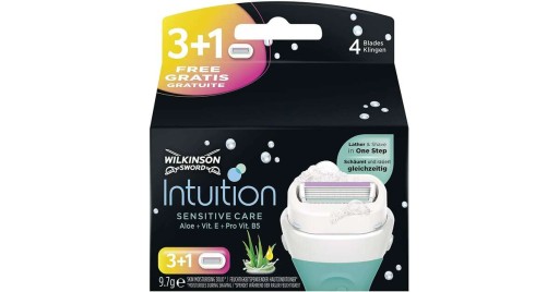 Proste i wygodne żyletki Wilkinson Intuition Sensitive Care są idealne dla aktywnych kobiet. 4 ostrza są otoczone odżywką do skóry, która pieni się, goli i nawilża w jednym kroku - bez żelu do golenia.