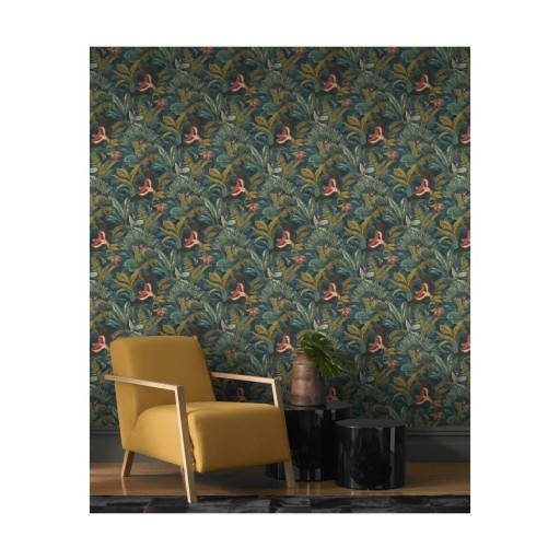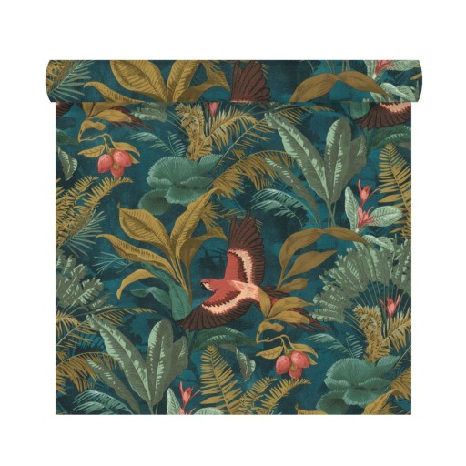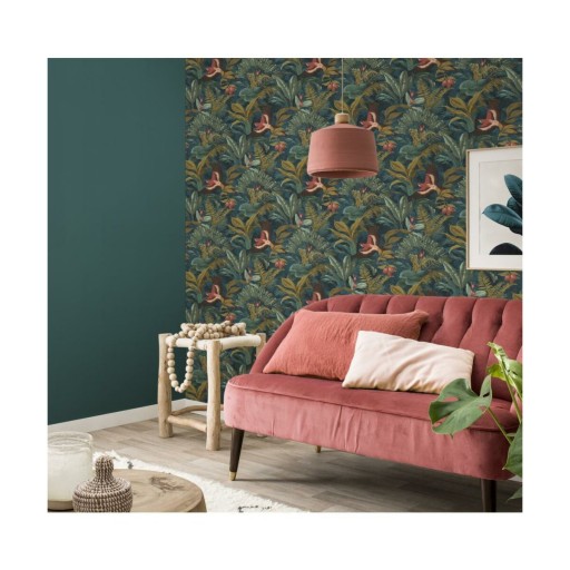 Wyjątkowa zielona tapeta Tropical Forest pozwoli Ci stworzyć oryginalną dekorację ścienną, która będzie punktem centralnym we wnętrzu. Aranżacje w stylu urban jungle podbijają serca influencerów. Możemy je oglądać w magazynach wnętrzarskich czy mediach społecznościowych, które dostarczają nam wiedzy z czym łączyć takie wzornictwo. Z naszą tapetą bujna roślinność zakwitnie na Twojej ścianie. Ciekawy motyw liści w towarzystwie lecących ptaków przeniesie Cię na egzotyczną wyspę. Całość utrzymana w spokojnej ciemnej kolorystyce zieleni, pozwoli Ci się wyciszyć po ciężkim dniu pracy. Tego typu wzornictwo dobrze czuje się w towarzystwie drewnianych dodatków. Tapeta najbardziej efektownie będzie wyglądała na jednej ścianie. Reszta dodatków powinna być bardziej stonowana, w jednolitych kolorach bez wzoru.