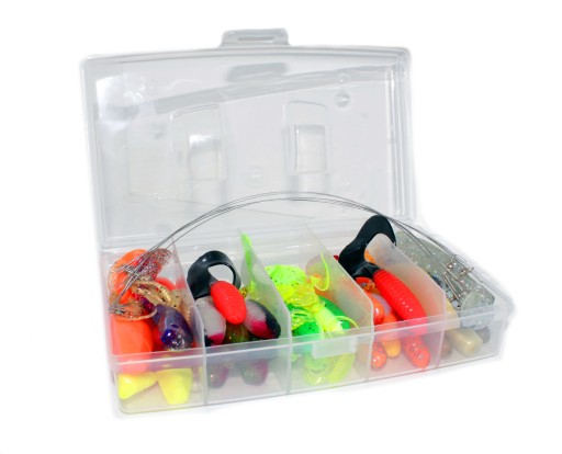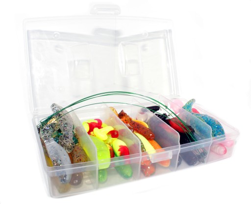 Cały zestaw jest spakowany w Pudełko na akcesoria wędkarskie z 5 przegródkami. Pudełko jest lekkie i poręczne, zamykane co uniemożliwia przypadkowe otwieranie się.