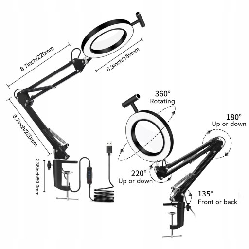 2. Regulacja głowicy świetlnej: Głowicę świetlną tej lupy można regulować w górę iw dół o 220° i obracać o 360°, a także ma ramię teleskopowe, którego długość można regulować (pojedyncza sekcja 22 cm lub 8,7 cala).