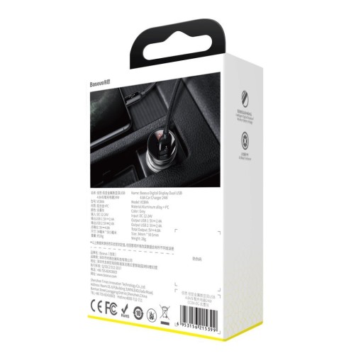 Автомобильное зарядное устройство с ЖК-дисплеем BASEUS Digital Display, 2 x USB 4,8 А, 24 Вт, серые