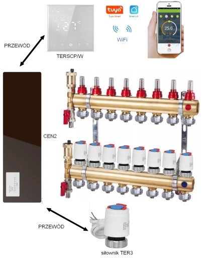 Do stworzenia zestawu działającego w jednym ekosystemie app TUYA trzeba dobrać urządzenia z innych naszych aukcji takich jak termostat dopuszkowy TERSCP + siłownik TER3P + centrala sterująca CEN2P/CEN2/CEN3