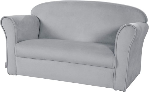 Miękka, tapicerowana mini sofa jest dostępna w kolorze szarym, zachwyca poszyciem welurowym. Dzięki bocznym oparciom sofa dziecięca zapewnia dodatkowy komfort i bezpieczeństwo.