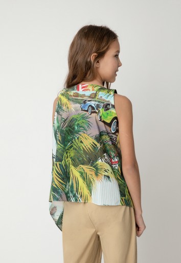 Stylowy top wykonany z ozdobnej popeliny to doskonały dodatek do każdego dołu z kolekcji Kraft. Ciekawy wzór tkaniny, stanowiący kompozycję fabularną, idealnie „pasuje” do modnego kształtu blatu z asymetryczną linią półki. Top posiada paski wykonane z nadrukowanych chust (plecionek), które wkręca się w oczka w celu mocowania i można je dopasować do każdego wzrostu dziecka. Skład: 100% bawełna